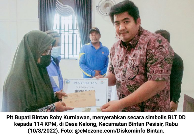BINTAN | WARTA RAKYAT – Pelaksana Tugas (Plt) Bupati Bintan Roby Kurniawan, menyerahkan secara simbolis Bantuan Langsung Tunai (BLT) Dana Desa (DD) kepada 114 KPM (Keluarga Penerima Manfaat), di Desa Kelong, Kecamatan Bintan Pesisir, Rabu (10/8/2022).