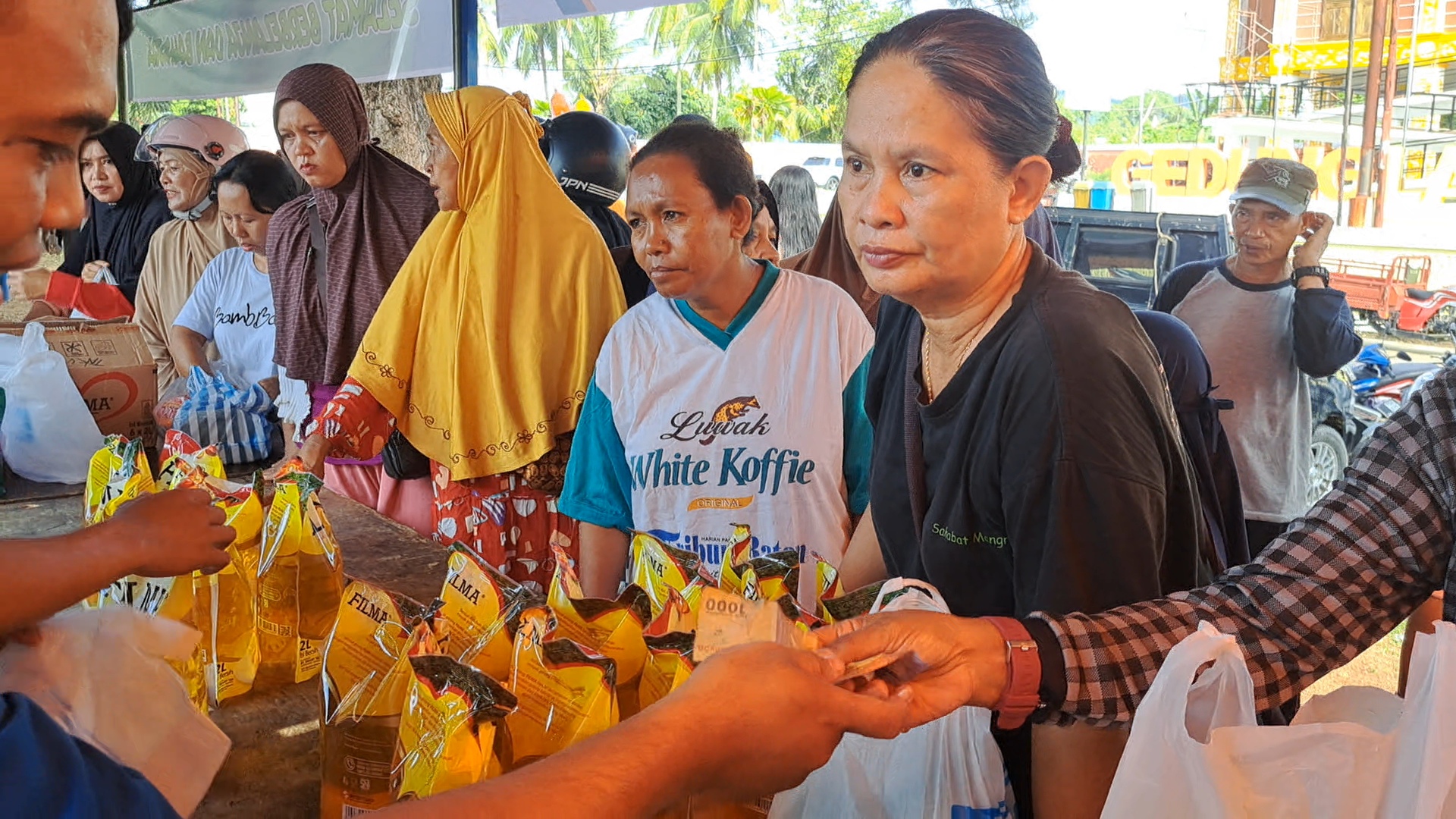 “Di sini harga minyak lebih murah dua ribu rupiah dibandingkan di pasar biasa. Lumayan sangat membantu,” kata Bu Tini, salah satu pengunjung.