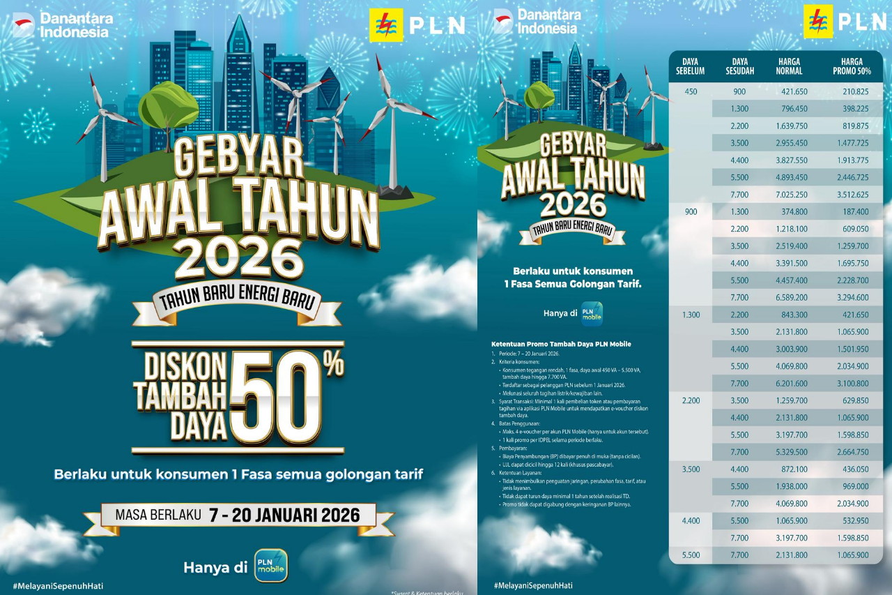 Program spesial bertajuk “Tahun Baru Energi Baru” dapat dinikmati oleh seluruh pelanggan tegangan rendah satu fasa di semua golongan tarif dengan daya awal 450 volt ampere (VA) hingga 5.500 VA, yang ingin menambah daya hingga 7.700 VA.