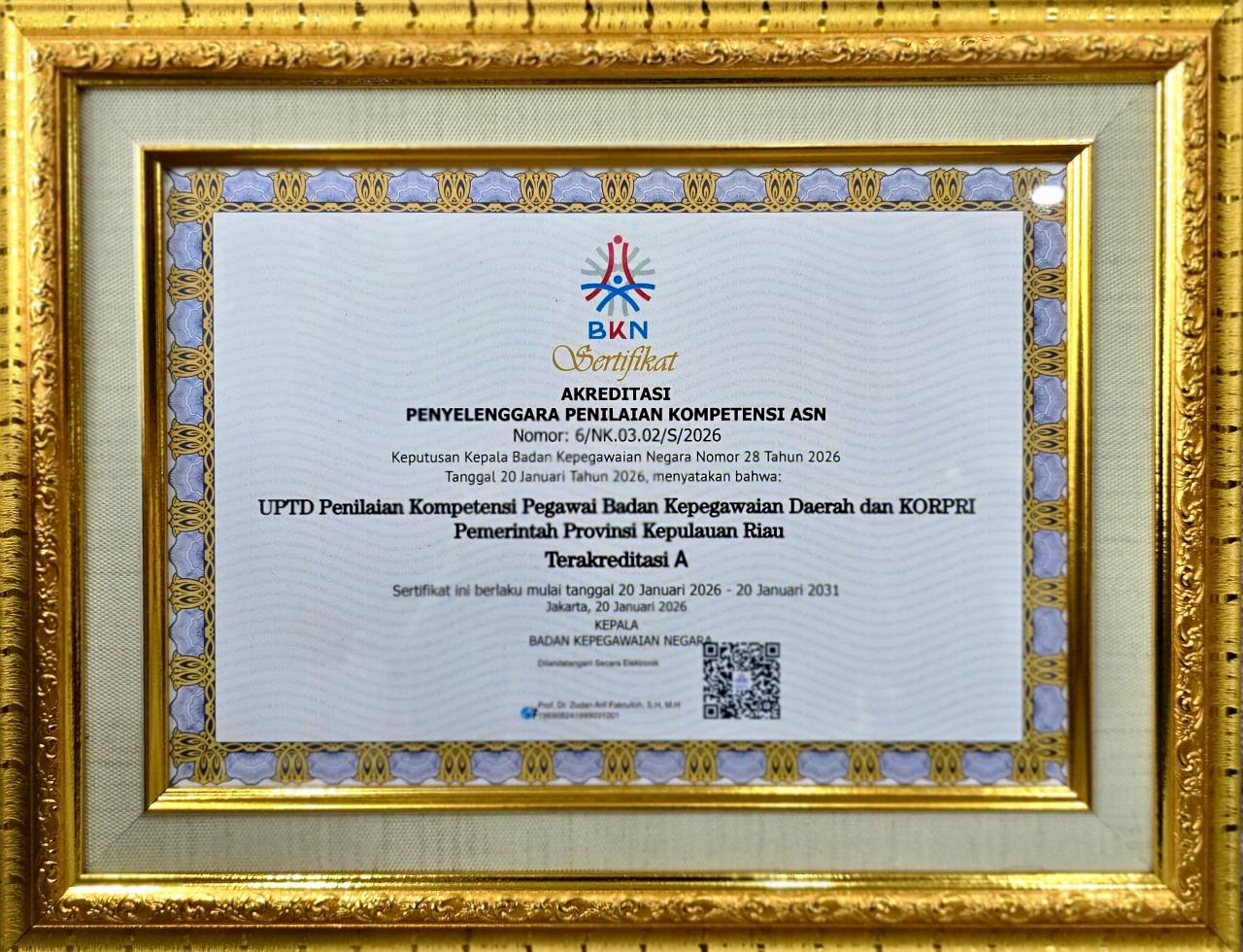 Sertifikat akreditasi tersebut diserahkan diserahkan langsung oleh Kepala BKN Zudan Arif Fakrulloh kepada Kepala BKD dan KORPRIProvinsi Kepulauan Riau, Yeny Trisia Isabella, di Aula Gedung 1 Lantai 5 Kantor Pusat BKN, Jakarta Timur, Jumat (23/1/2026).
