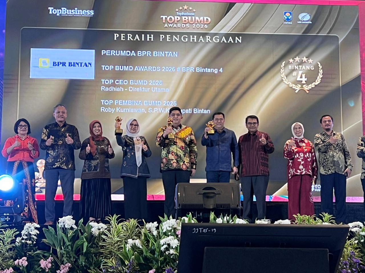 Tak tanggung-tanggung, BPR Bintan menyabet tiga penghargaan sekaligus. Penghargaan ini terdiri dari TOP Pembina BUMD 2026 yang diberikan kepada Bupati Bintan Roby Kurniawan, TOP BUMD Awards 2026 kategori BPR #Bintang4 yang diberikan kepada Perumda BPR Bintan, kemudian TOP CEO BUMD 2026 yang diberikan kepada Radhiah selaku Direktur Utama.